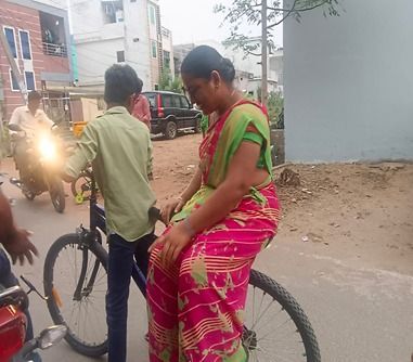 Pictured: Taj and his mother get around by bike. Bicycle passengers riding “side-saddle” is common in South Asia!